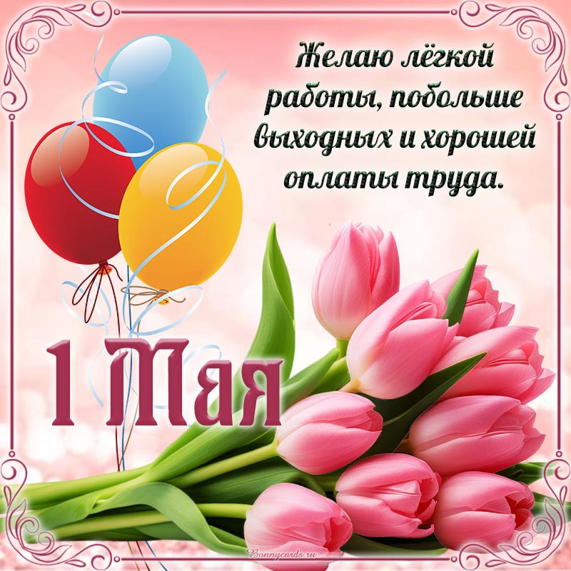 Красивая картинка с тюльпанами и шариками на 1 Мая.