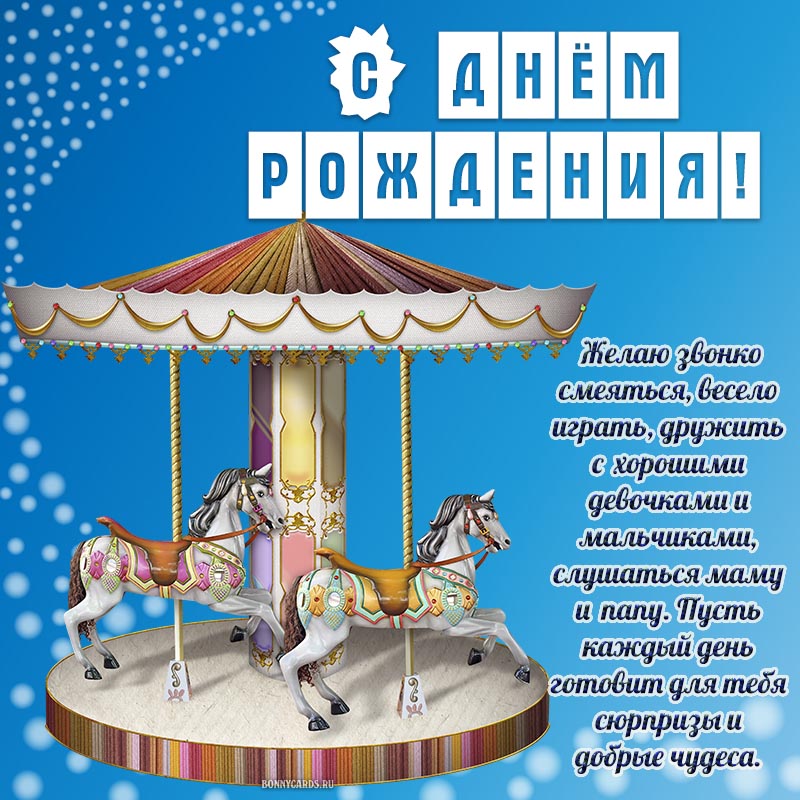 Открытка - карусель с конями и пожелание на день рождения ребенку