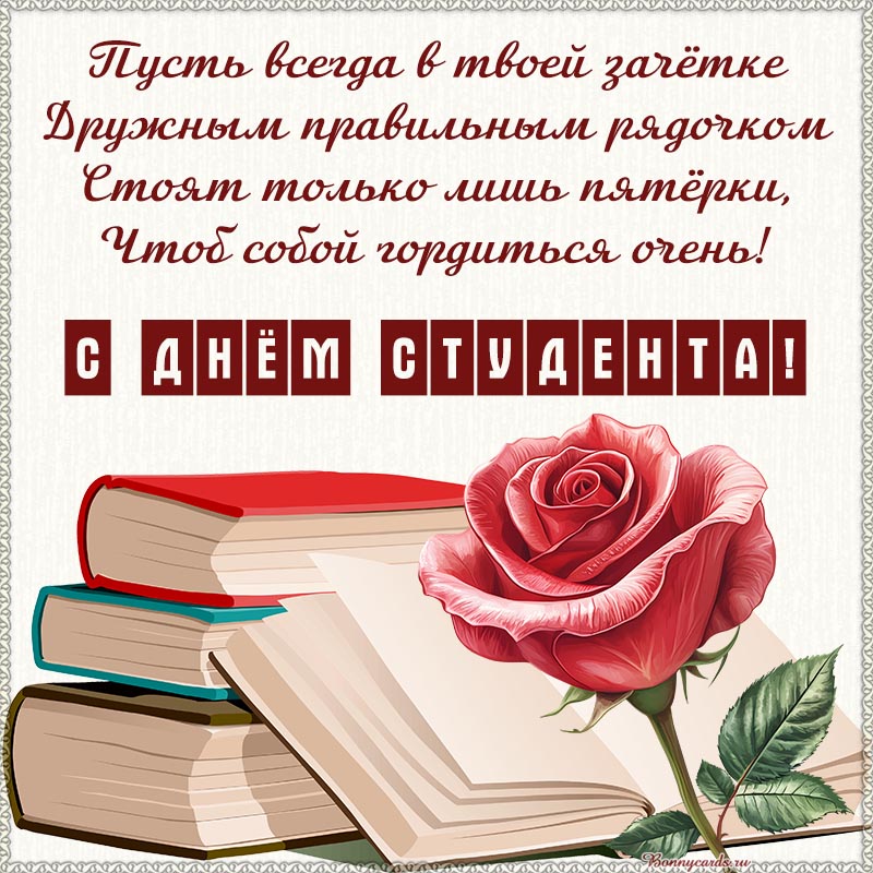Открытка - супер пожелание в стихах, книги и роза на День студента