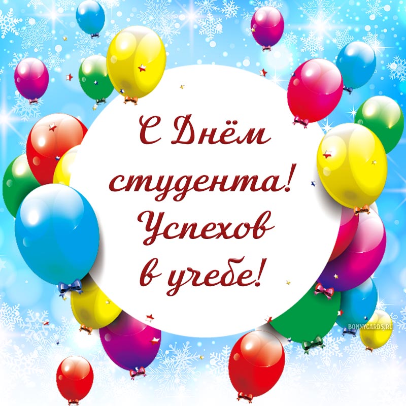 Открытка с яркими шариками и снежинками на День студента.