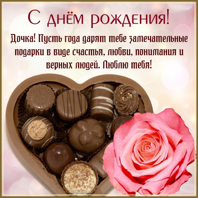 Открытка с конфетами и цветком дочери на день рождения.