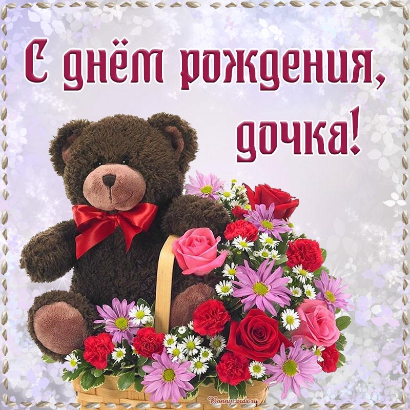 Чарующая картинка с медведем в корзине с цветами дочке на день рождения