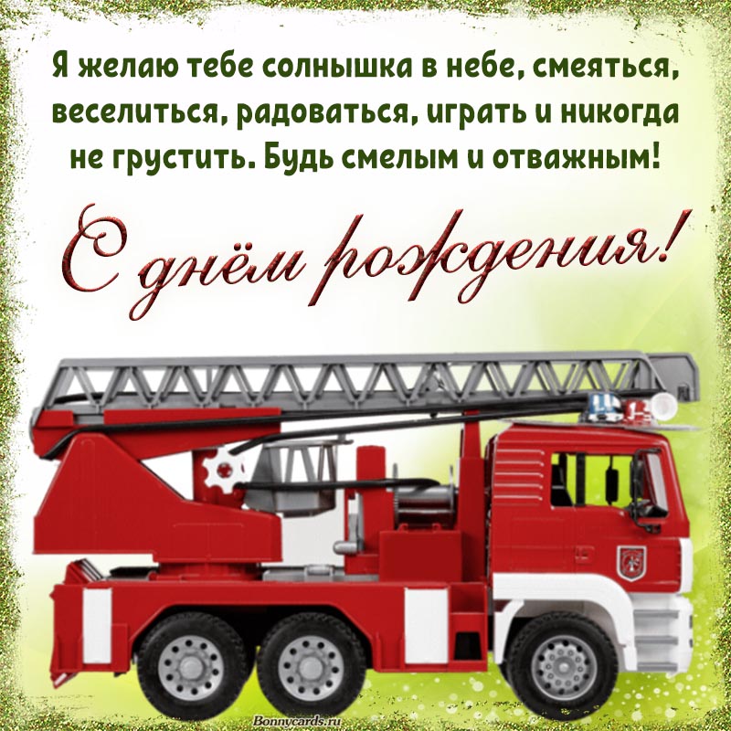 Открытка мальчику на день рождения. Пожарная машина, пожелание солнышка и быть отважным