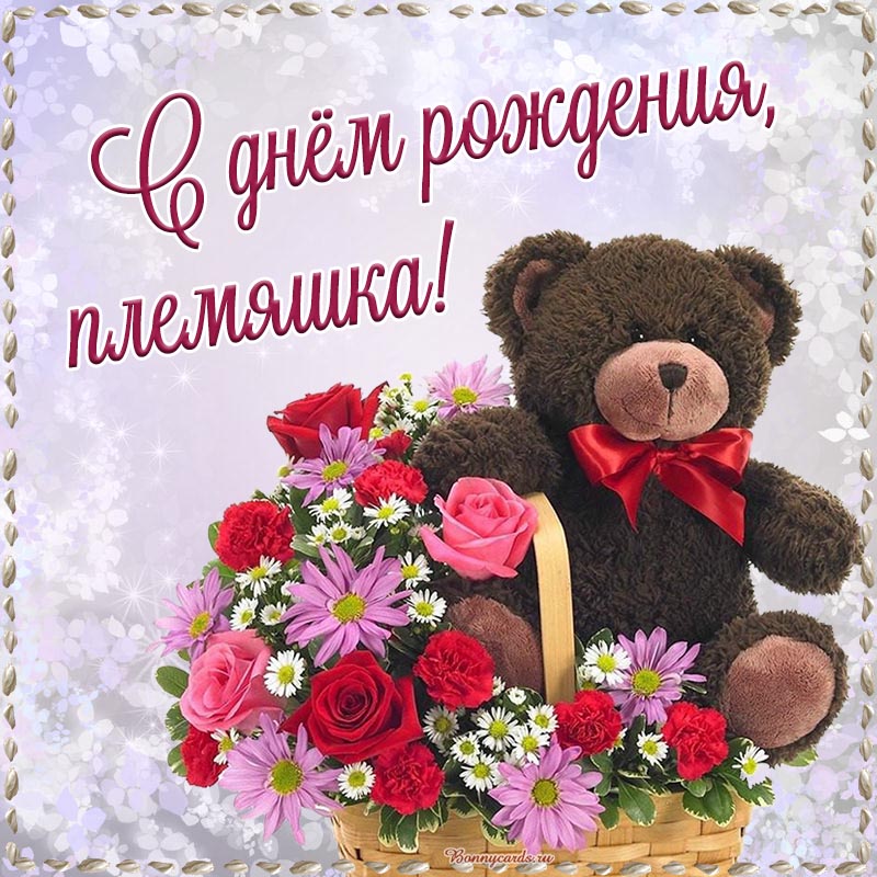 Открытка - корзина цветов и медведь племяшке на день рождения