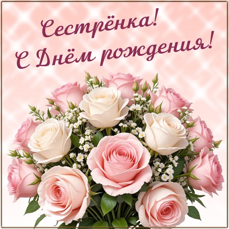 Открытка с нежными розочками сестрёнке на день рождения.