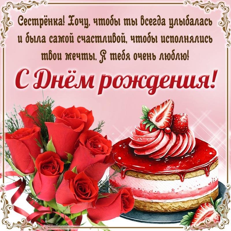 Дивная картинка с тортом и клубникой в рамочке сестрёнке на день рождения