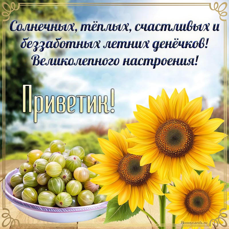 Летняя открытка с крыжовником и яркими подсолнухами