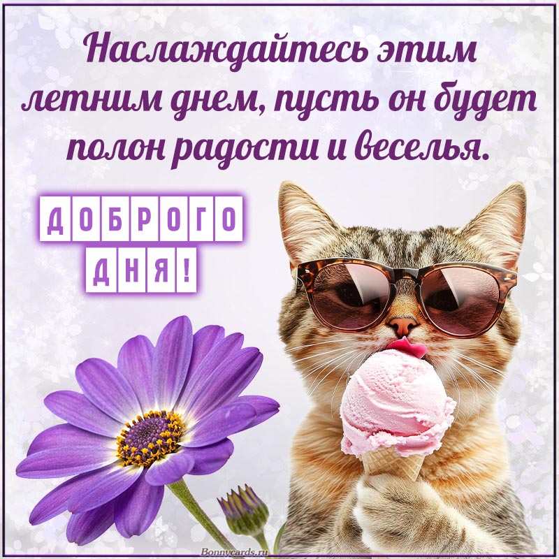 Картинка с котом, мороженым и пожеланием доброго дня.