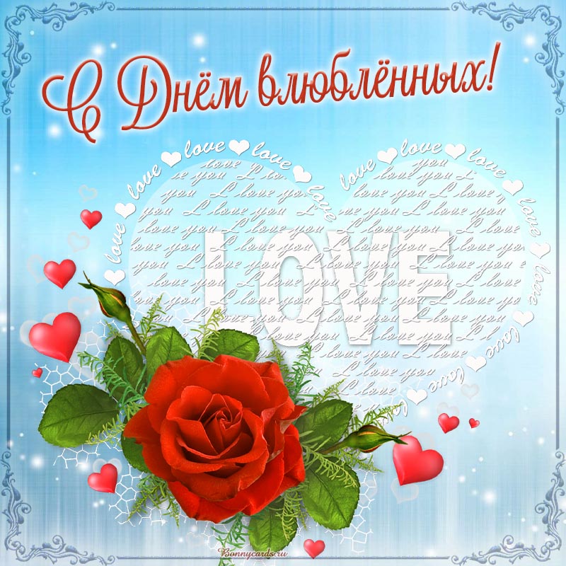 Открытка с цветком на голубом фоне на День влюбленных.