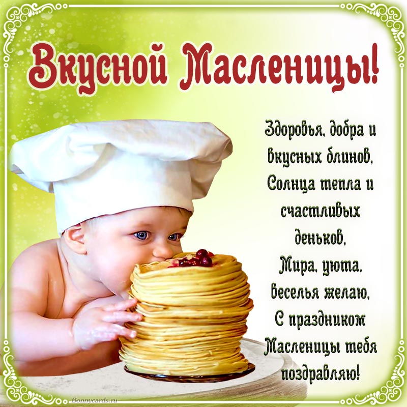 Открытка - милый малыш с блинами и пожелание вкусной Масленицы