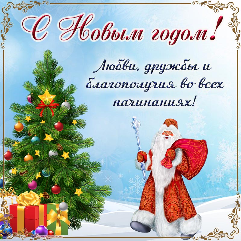 Новогодняя открытка с Дедом Морозом, ёлкой и подарками