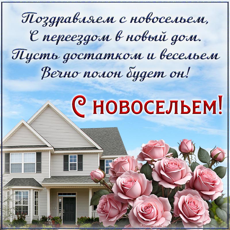 Электронная открытка на новоселье с цветами и домом