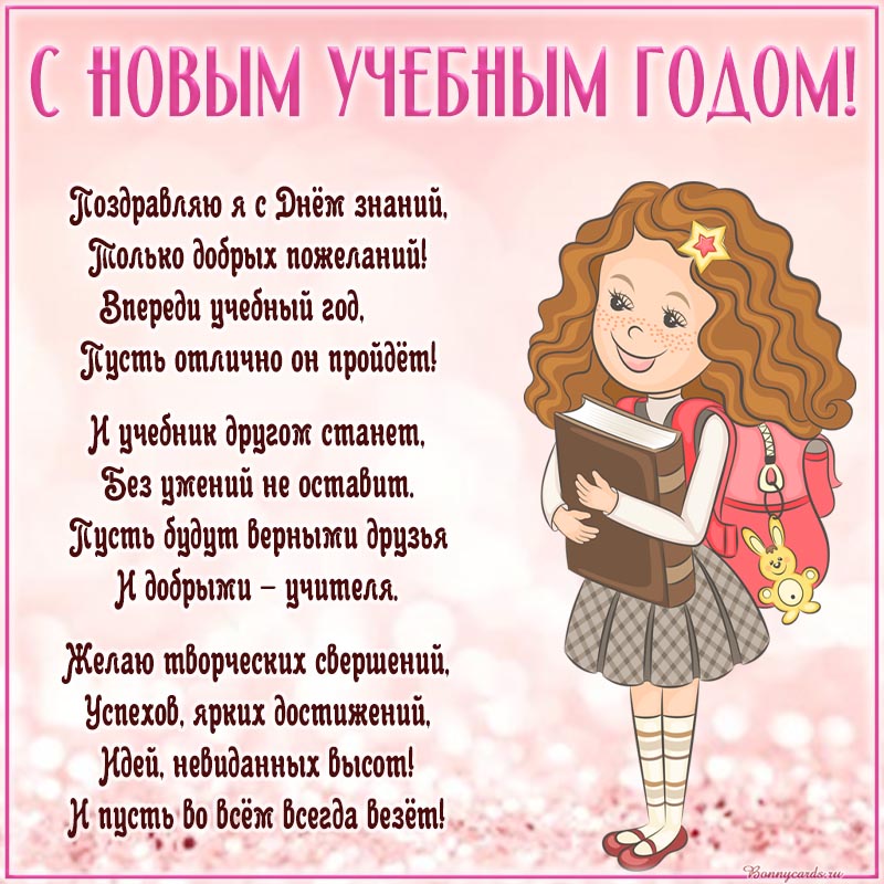 Открытка на День знаний - девочка и душевное стихотворение к новому учебному году
