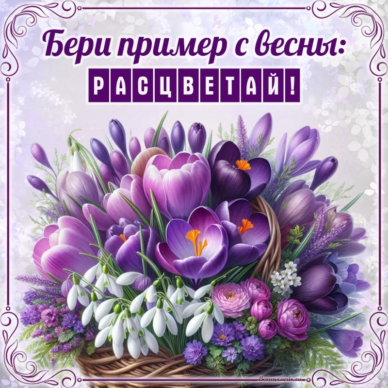 Открытка - корзина с крокусами, бери пример с весны: расцветай