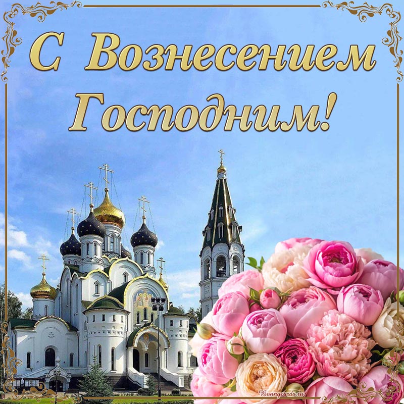 Открытка с цветами и собором на Вознесение Господне.