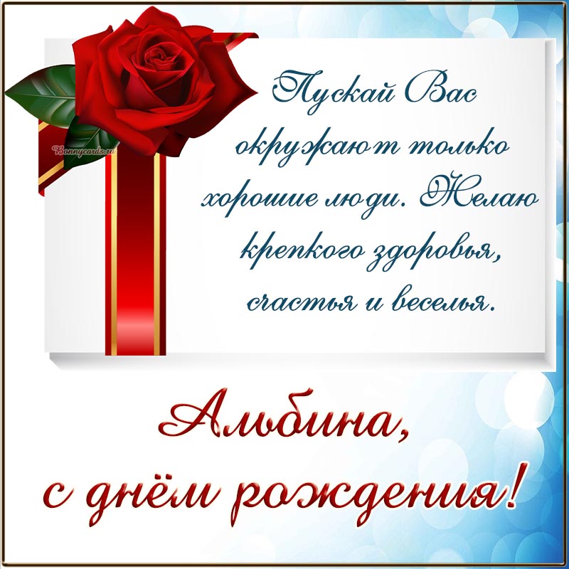 Открытка на день рождения - красная розочка и душевное поздравление для Альбины
