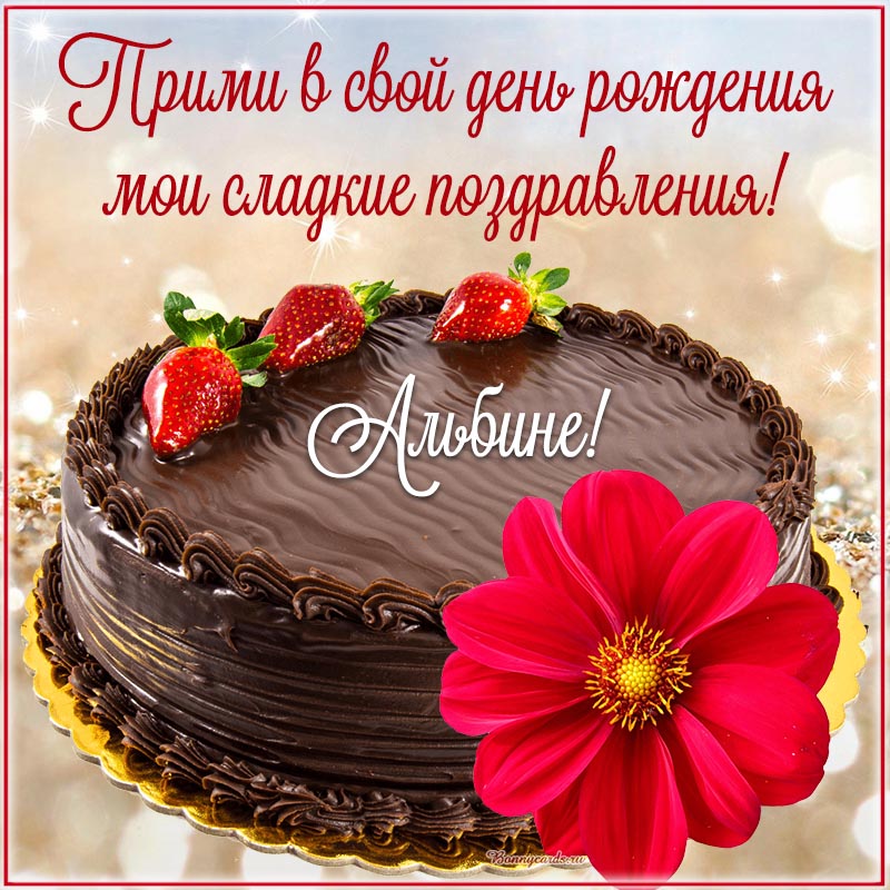 Открытка на день рождения. Торт и надпись - Альбина, прими мои сладкие поздравления