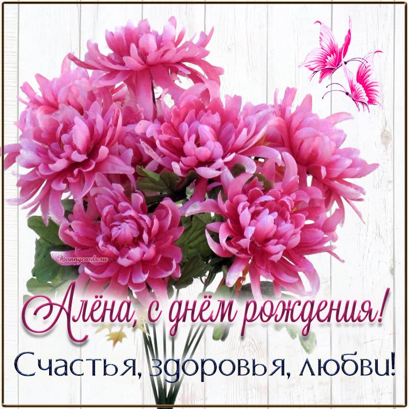 Открытка на день рождения - букетик, бабочки и пожелание Алёне счастья и здоровья