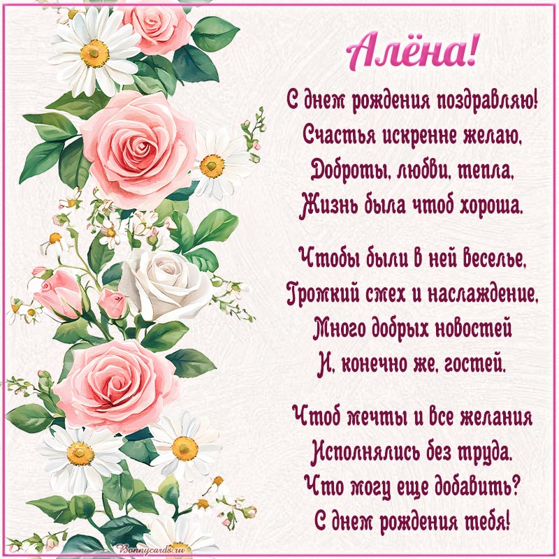 Открытка на день рождения - отличное стихотворение и цветочки в рамочке Алёне