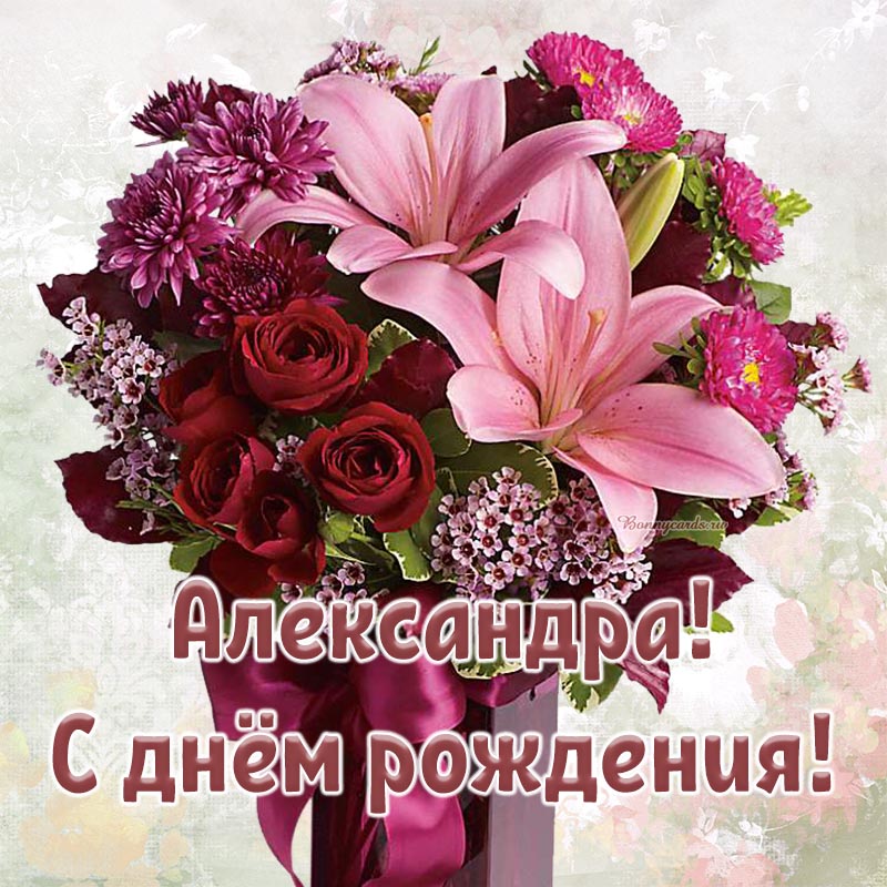 Прелестная открытка с букетом Александре на день рождения.