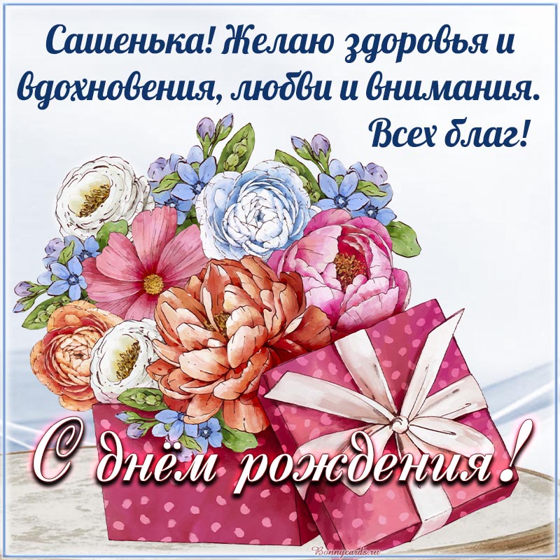 Открытка на день рождения - пожелание Сашеньке вдохновения, внимания и всех благ