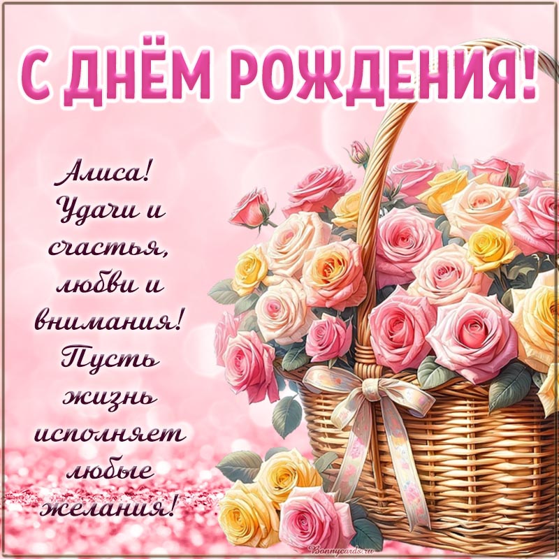 Открытка на день рождения - великолепное поздравление Алисе на фоне роз в корзине