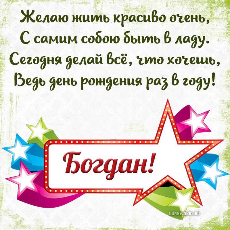Открытка Богдану на день рождения. Желаю жить красиво очень, с самим собою быть в ладу