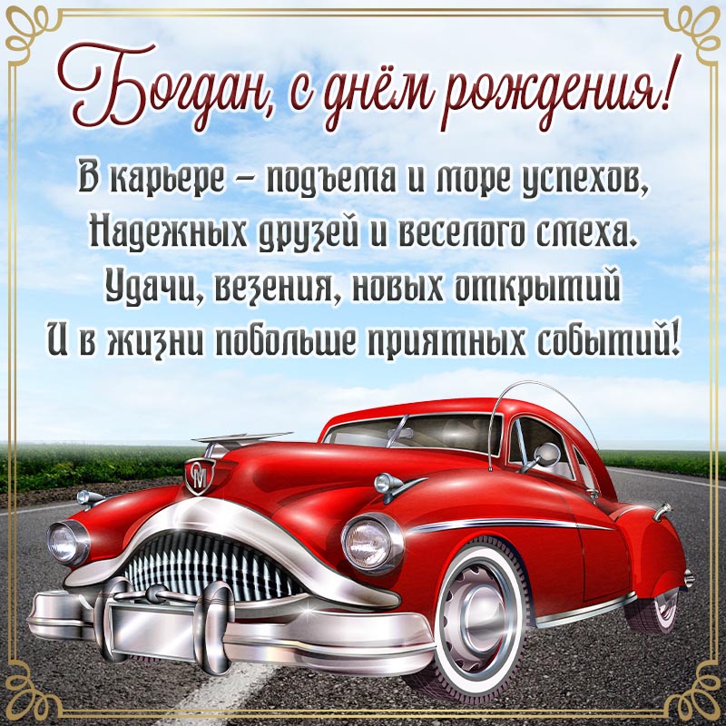 Открытка на день рождения - ретро автомобиль и пожелание подъема в карьере Богдану