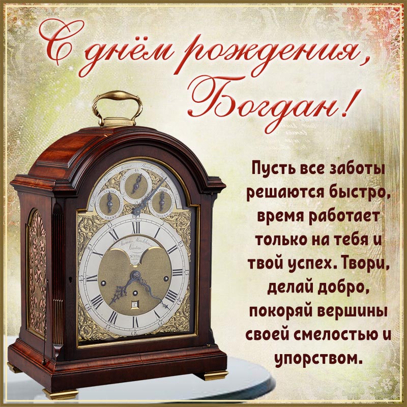Открытка - сердечное поздравление и часы Богдану на день рождения