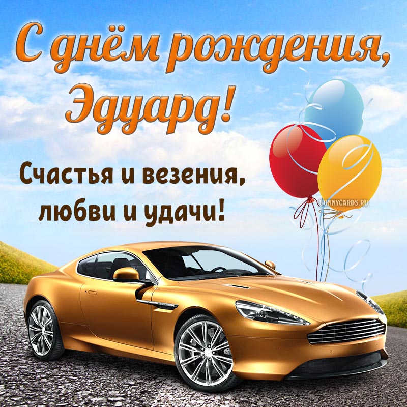 Открытка на день рождения. Автомобиль и пожелание Эдуарду счастья, везения, любви