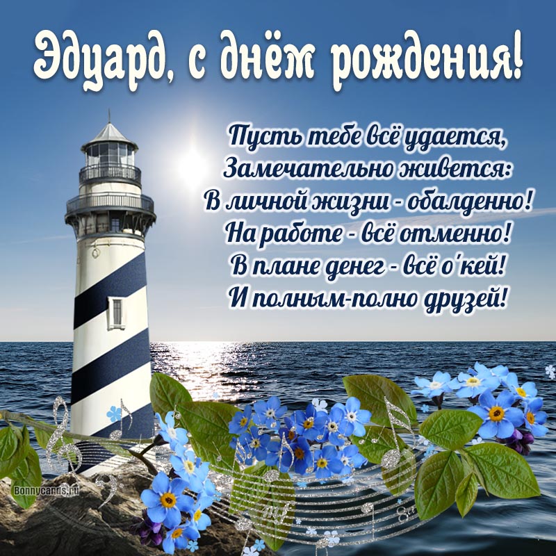 Открытка с цветочками и маяком на день рождения Эдуарду