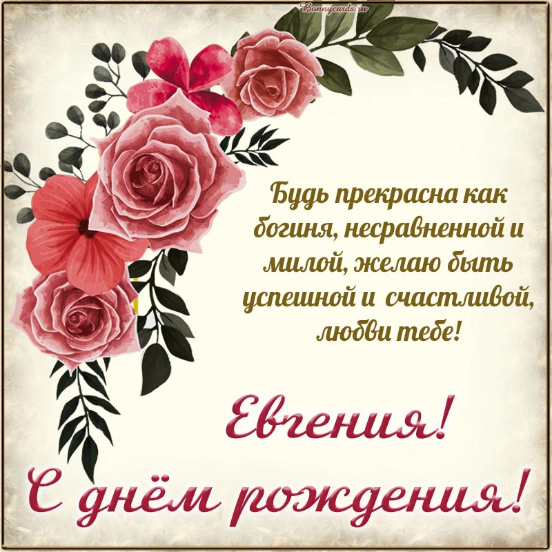 Открытка с цветами и пожеланием Евгении на день рождения.