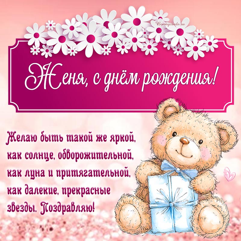 Бесподобная картинка с мишкой, подарком и ромашками Жене на день рождения