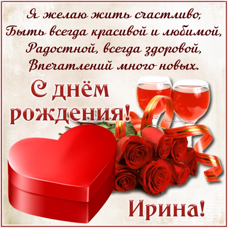 Праздничная открытка с бокалами и сердечком Ирине на день рождения