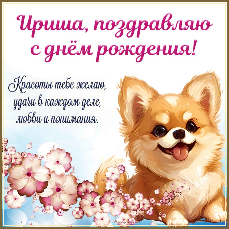 Открытка на день рождения. Собачка и пожелание красоты, удачи и понимания Ирише