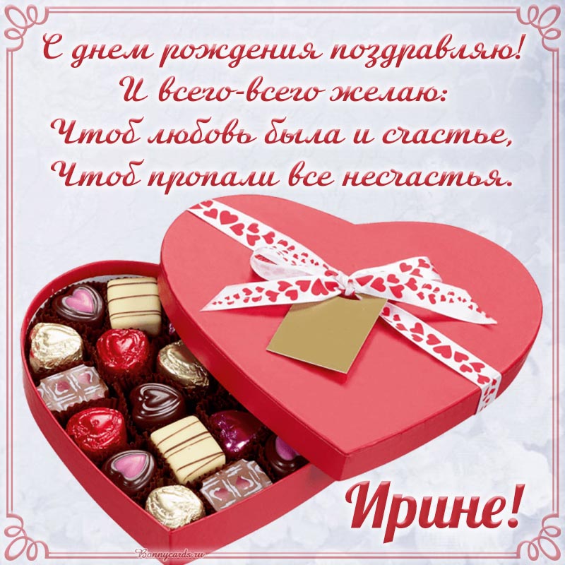 Открытка с вкусными конфетами и стихотворением Ирине на день рождения