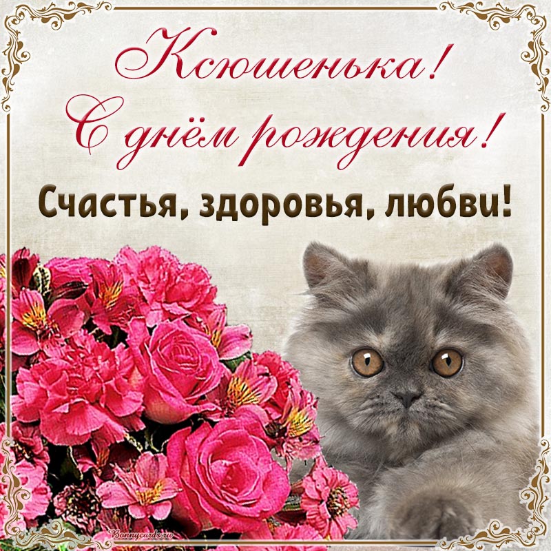 Очаровательная открытка с букетом и котом Ксюшеньке на день рождения