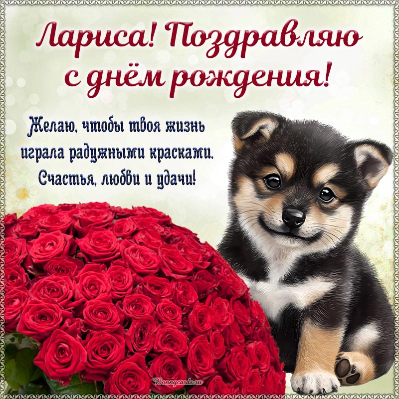 Открытка на день рождения - собака, красные розочки и сердечное поздравление Ларисе