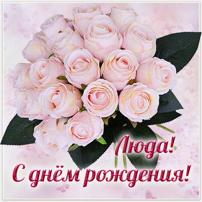 Розы на светлом фоне и надпись - Люда, с днём рождения