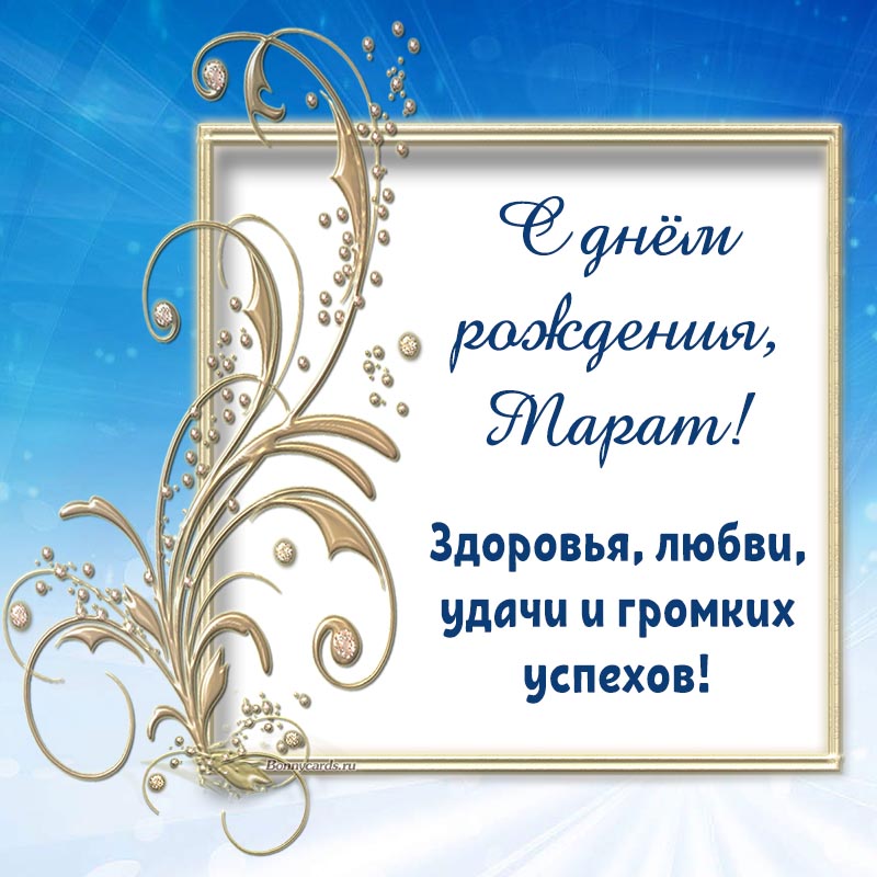 Открытка на день рождения - пожелание здоровья и громких успехов Марату в рамочке