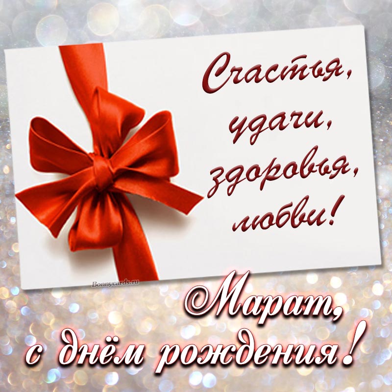 Открытка на день рождения - красный бант и пожелание счастья, удачи, любви Марату