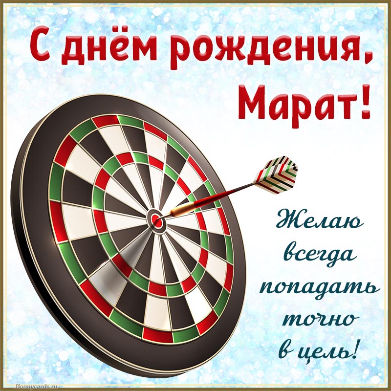 Открытка Марату на день рождения. Дартс и надпись - желаю всегда попадать точно в цель