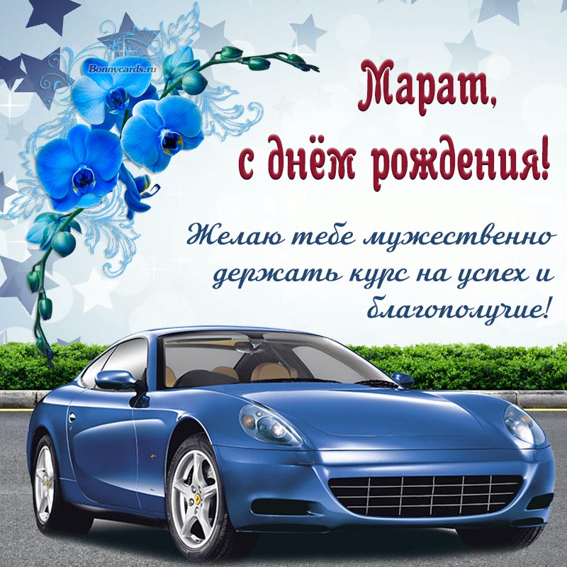 Открытка Марату - мужественное пожелание, авто, цветочки на день рождения