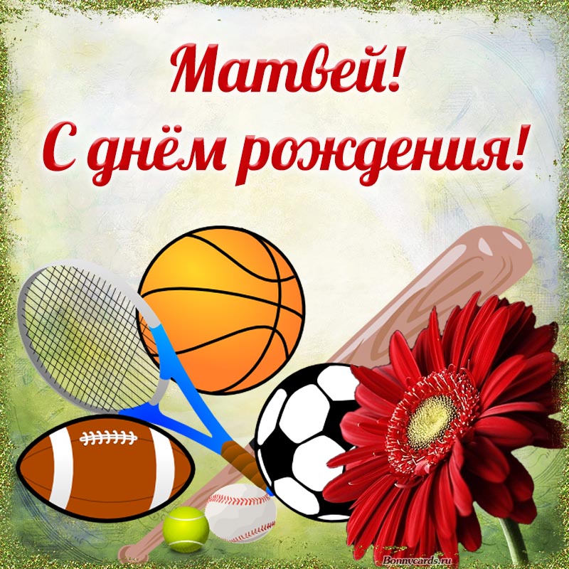 Картинка с цветком и мячами Матвею на день рождения