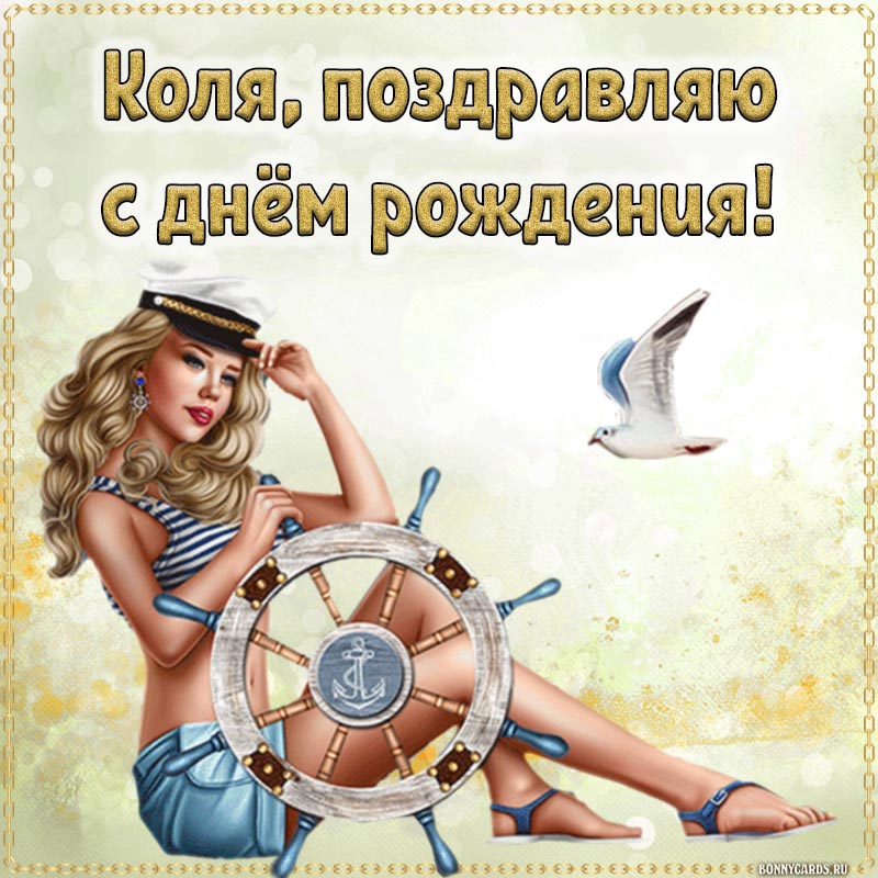 Электронная открытка с девушкой, штурвалом и птицей Коле на день рождения