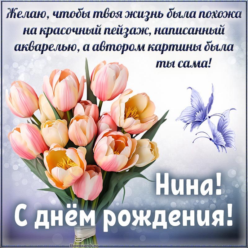 Открытка на день рождения - тюльпаны и волшебное поздравление на синем фоне Нине