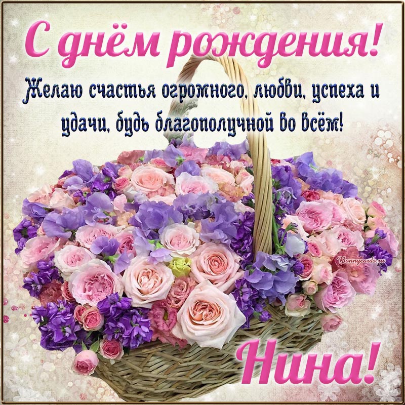 Открытка на день рождения - праздничное поздравление и цветочки в корзине для Нины