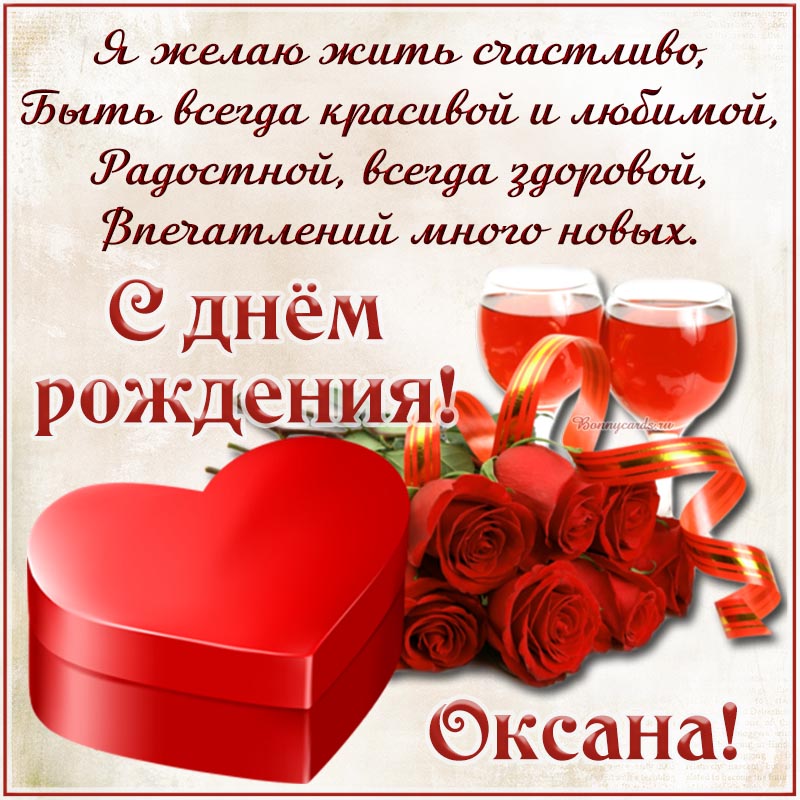 Открытка на день рождения - розочки, сердце и отличное поздравление в стихах Оксане