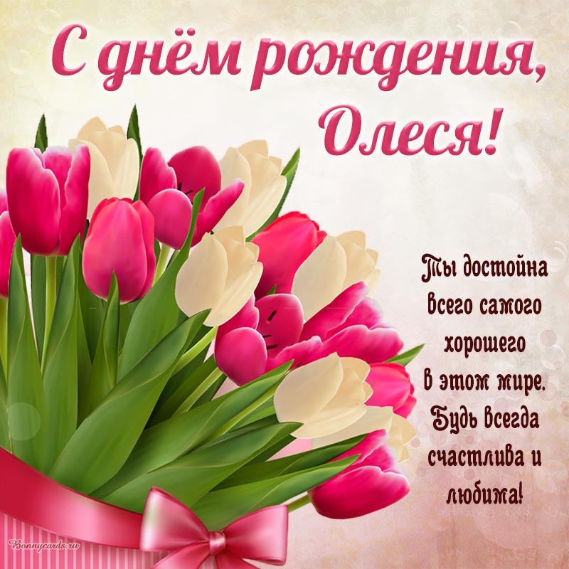 Супер открытка с красивыми тюльпанами и бантом Олесе на день рождения