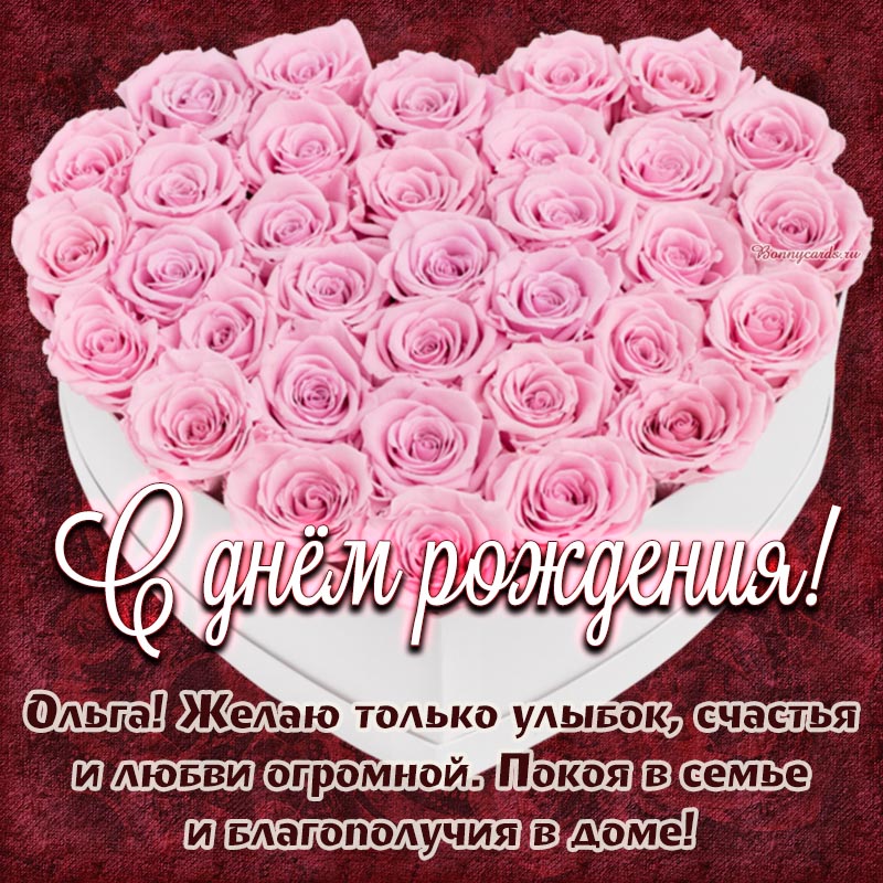 Открытка на день рождения. Ольга, желаю улыбок, покоя в семье и благополучия в доме